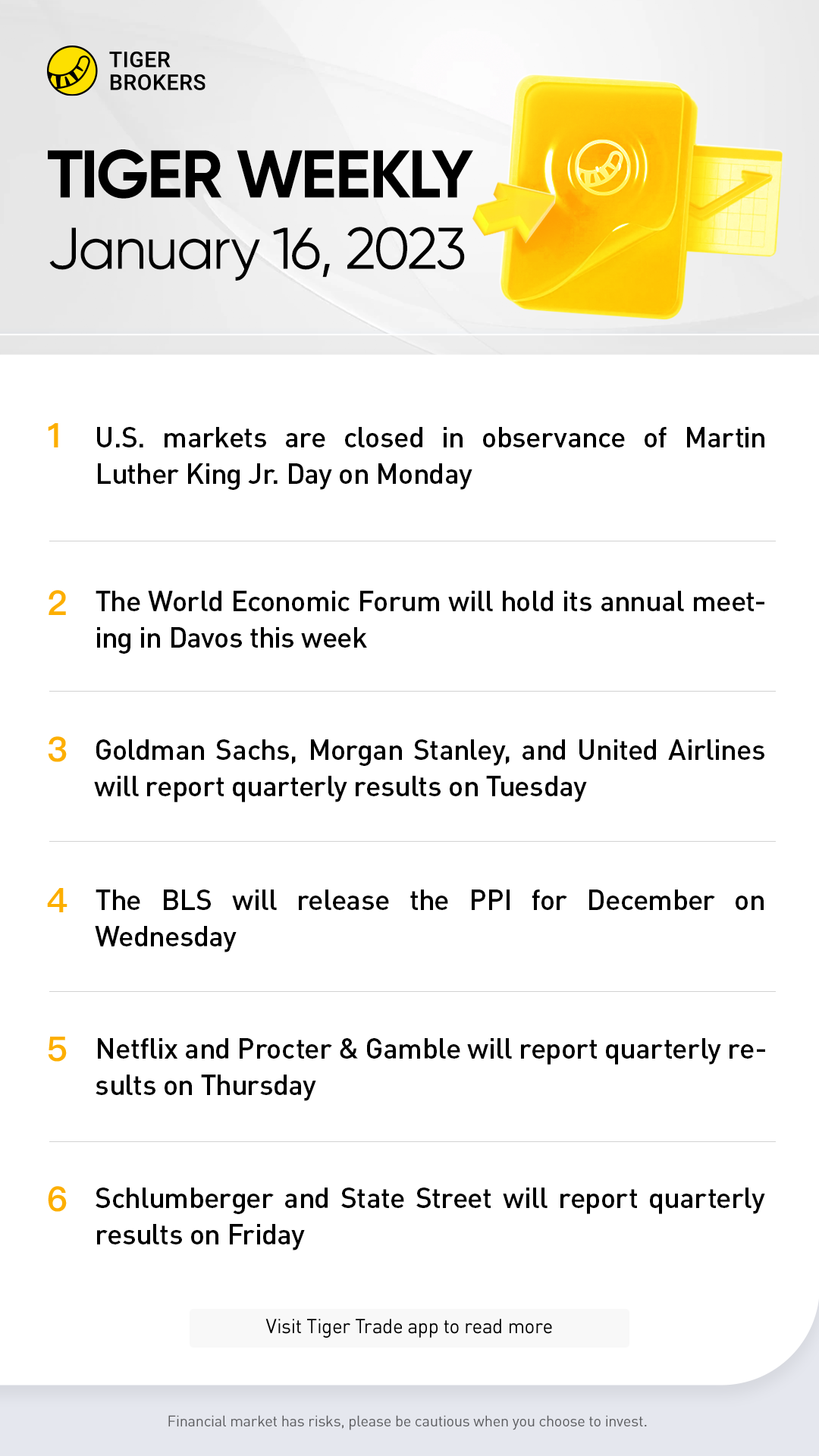 Stock and bond markets will be closed on Monday for Martin Luther King Jr. Day. It will be a busy week of fourth-quarter earnings season once Wall Street reopens.