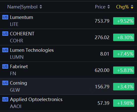 Optical communication stocks jumped. Lumentum rose nearly 10%; Coherent rose over 8%; Lumen Technologies rose over 7%; Fabrinet rose nearly 6%; Corning up over 3%.