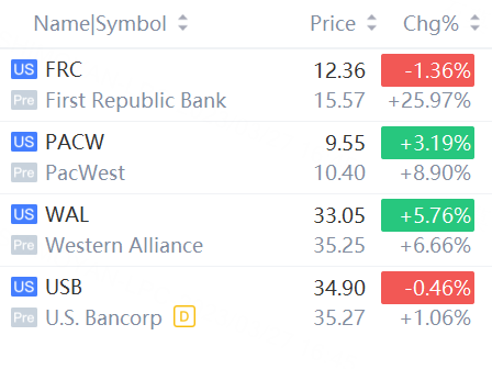 First Republic Bank rose over 25%; PacWest rose 9%; Western Alliance rose over 6%; U.S. Bancorp rose 1%.