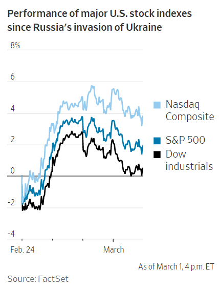 Major U.S. stock indexes have been relatively resilient, with the S&P 500 and Nasdaq Composite both up at least 1.9% since Russia invaded Ukraine. Investors so far have been calm in the face of the conflict and many have used the opportunity offered by lower prices to buy. Data suggest that risks facing U.S. banks with exposure to the region are limited.
