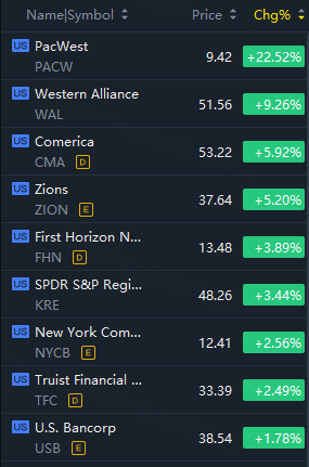 Regional banks took off in morning trading after PacWest’s news; Western Alliance soared over 9% while Comerica jumped over 5%.