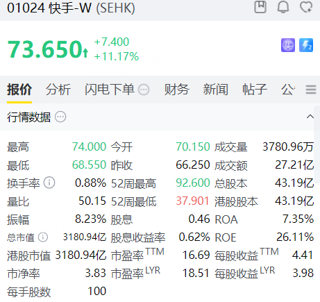 港股异动 | 快手涨幅扩大至11%,成交额超27亿港元