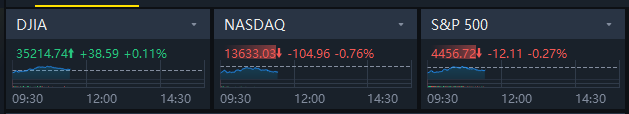U.S. stocks mixed in morning trading; Dow Jones rose 0.11%, S&P 500 slid 0.27% while Nasdaq fell 0.76%.