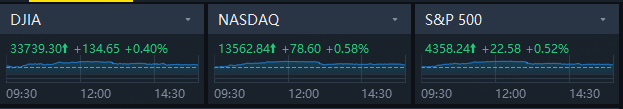 The Dow Jones Industrial Average rose 134.65 points, or 0.4%, to 33,739.3, the S&P 500 gained 22.58 points, or 0.52%, to 4,358.24 and the Nasdaq Composite added 78.61 points, or 0.58%, to 13,562.84.