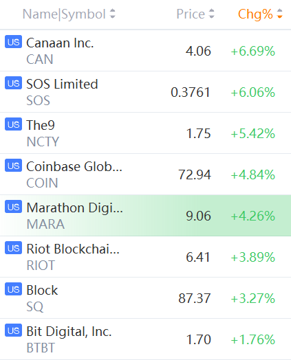 Marathon Digital, Coinbase, SOS Limited, The9, and Block rose between 1% and 6%.
