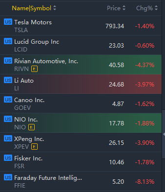 EV stocks slipped in morning trading. Tesla, Rivian, Nio, LI Auto, Faraday, Canoo and Fisker rose between 1% and 8%.