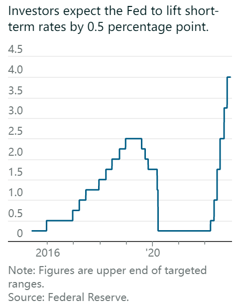 The Fed is widely expected to lift its federal-funds rate target on Wednesday by 0.50 percentage point, to a range of 4.25% to 4.50%, following four consecutive hikes of 0.75 percentage point.