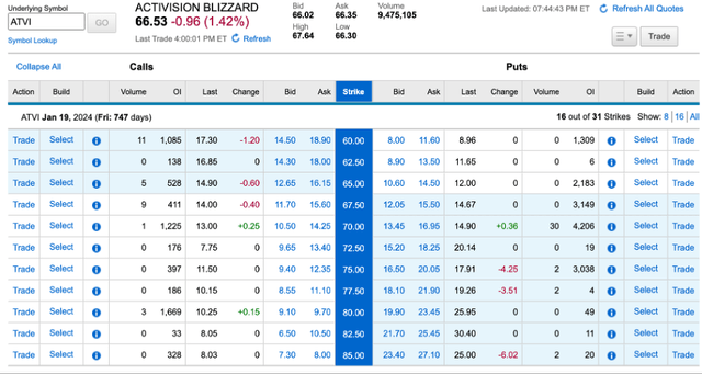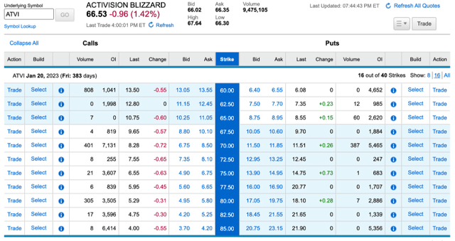Below are the options chains for Activision for 2023. The strike prices I would probably look at more closely for investors that might be interested are $70, $75, and $80. I will be keeping an eye out for a dip in shares before buying any calls though, as even a small drop in share price can make the price of these options much more appealing. My first choice here would probably be the $70 strike.