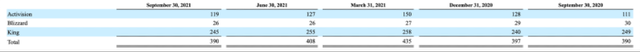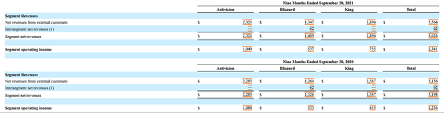 In a market environment where some companies are valued using pixie dust and metrics that make little sense, Activision stands out as a tech company with huge operating margins. Each segment has an operating margin at 40% or better, with the overall operating margin sitting at 41.6% for the whole company in the first nine months of 2021. I want to make it perfectly clear that these operating margins are absolutely massive for any industry. For investors who have confidence in the company’s continued ability to develop existing franchises and create compelling new releases, Activision is a proven operator in the video game industry that could be an interesting choice at current prices.