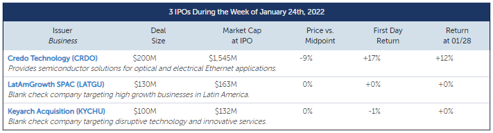 Connectivity solutions provider Credo Technology downsized and priced at the low end to raise $200 million at a $1.5 billion market cap. Founded by three former Marvell employees, Credo Technology provides semiconductor solutions for optical and electrical Ethernet applications. Despite being highly reliant on large customers with volatile order patterns, the company saw triple digit product revenue growth in FY1H22.