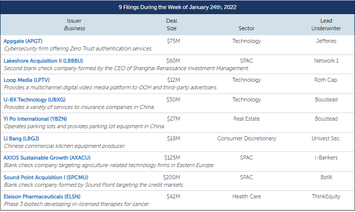 Six IPOs submitted initial filings this week, all raising less than $100 million. "Zero trust" cybersecurity firm Appgate(APGT) led the way, filing to raise $75 million in an uplisting.Eleison Pharmaceuticals(ELSN), a Phase 3 biotech firm developing cancer therapies, filed to raise $42 million. Beijing-based business services firm U-BX Technology(UBXG) filed to raise $30 million.