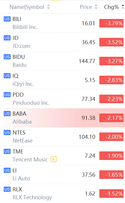 Baidu, JD.com, Bilibili fell over 3%; Alibaba, Pinduoduo, iQiyi, NetEase fell over 2%.