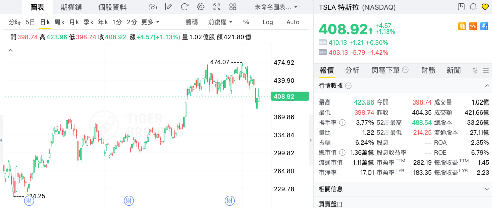 特斯拉股价周一盘中最高上涨 3%,当日收盘涨幅略超 1%。此次股价上涨之前,特斯拉股票经历了起伏的一周。尽管上周五股价有所回升,但全周累计下跌 5.9%。该股在周四和周五曾大幅跌破 400 美元支撑位,随后反弹收于 404.35 美元。周四当天,该股触及 9 月以来的最低水平。