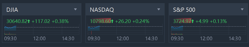 The Dow Jones Industrial Average added 117 points, or 0.38%. The S&P 500 and Nasdaq ticked up 0.1% and 0.2% respectively.