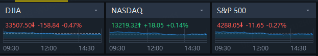 The Dow Jones Industrial Average fell 158.84 points, or 0.47%, to 33,507.5, the S&P 500 lost 11.65 points, or 0.27%, to 4,288.05 and the Nasdaq Composite gained 18.05 points, or 0.14%, to 13,219.32.