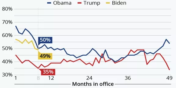 Biden held a press conference today, saying that the United States will withdraw from Afghanistan on August 31, and warned that the current security risks are getting bigger and bigger. Biden said the situation on the ground was fragile, and the Taliban said it would organize Afghan citizens to board the evacuation flight. Biden said he had instructed the Pentagon and the State Department to set a timetable for emergency evacuation and warned of the risk of Islamic State attacks outside the airport. White House Press Secretary Psaki said the White House is in contact with Afghans who have obtained special immigrant visas to provide detailed registration information; The United States has helped evacuate 48,000 Afghan refugees since August 14th. Airbnb said Tuesday it will provide free temporary housing for 20,000 Afghan refugees around the world. Affected by multiple events such as the Afghan incident and the congressional bill vote, Biden's support rate has fallen below 50% since he took office. The following picture shows the comparison of support rates among Obama, Trump and Biden during their tenure: