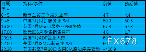 数据方面,中国7月财新制造业PMI、财新服务业PMI、美国ADP就业人数、初请失业金人数、6月贸易帐、7月季调后非农就业人口、7月失业率、6月批发销售月率等。
