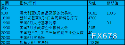 经济数据方面,英国央行将公布8月利率决定,预计英国央行的关注点将是看货币政策委员会中是否有人会取代现在已经离职的霍尔丹投票支持减少资产购买计划。
