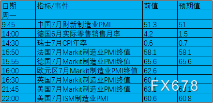 美国将公布7月Markit制造业PMI终值、以及7月ISM制造业PMI,预计7月数据将小幅高于6月,制造业继续扩张,因美国劳动力