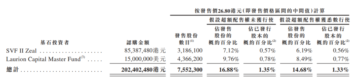 公司已订立基石投资协议,据此,基石投资者已同意在若干条件的规限下认购或促使其指定实体认购总金额约2.02亿港元(假设发售价为26.80港元,即发售价范围中位数),基石投资者将予认购的发售股份总数为755.23万股。基石投资者包括SVF II Zeal,及Laurion Capital Master Fund。作为有限合伙企业于泽西成立的Vision Fund为一家专注于全球科技行业投资的投资基金,其普通合伙人为SVF II GP (Jersey) Limited(一家于泽西注册成立的公司及软银集团的全资附属公司)。SVF II Zeal为一家由Vision Fund间接拥有多数股权的特殊目的公司。