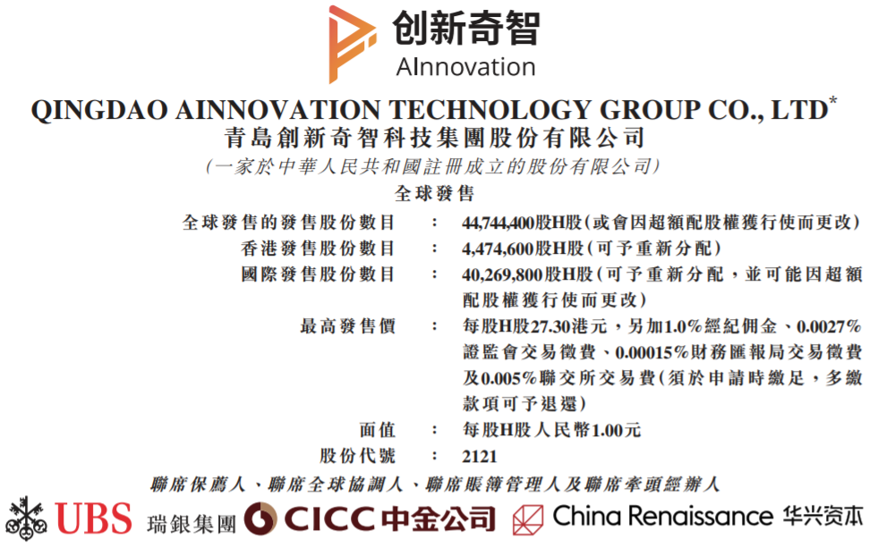 1月17日,创新奇智发布公告,公司拟全球发售4474.44万股股份,其中香港发售股份447.46万股,国际发售股份4026.98万股,另有15%超额配股权;1月17日至1月20日招股;发售价每股发售股份26.3-27.3港元,每手买卖单位100股,入场费约2757.5港元;瑞银、中金公司及华兴资本为联席保荐人;预期股份将于2022年1月27日于联交所主板挂牌上市。