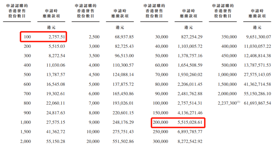 乙组门槛为20万股,申购所需资金约5515028.61港元。