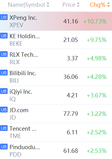 JD.com, Pinduoduo, Baidu, NetEase, Xpeng Motors, Tencent Music, IQiyi, KE Holdings and RLX Technology climbed from 2% to 10%
