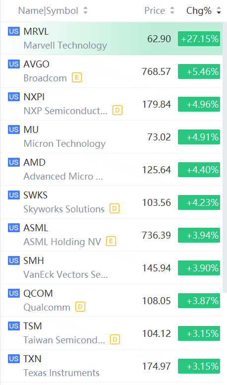 Broadcom rose 5.46%; NXPI, Micron, AMD, SKWS rose over 4%; ASML, SMH, Qualcomm, TSM, TXN rose over 3%.