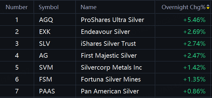 Silver stocks & ETFs shined in overnight trading. AGQ up over 5%; Endeavour Silver , SLV, Silvercorp up over 2%.