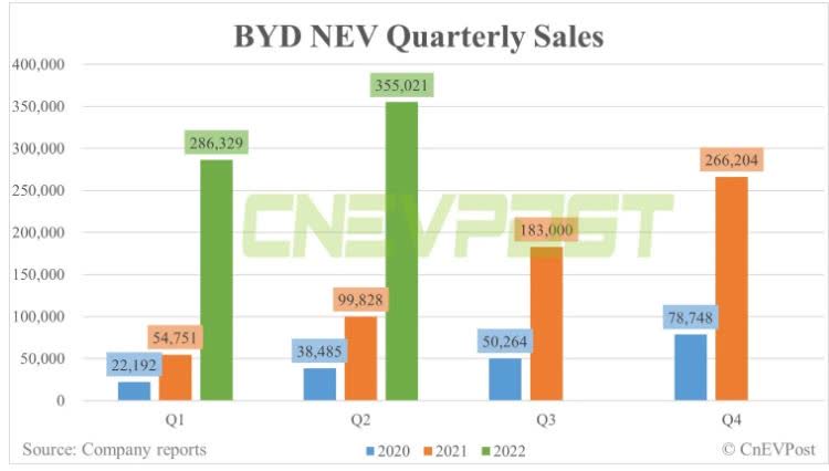 The company's June sales jumped 224.02% Y/Y and 16.61% M/M to 134,036 vehicles and Q2 sales jumped 255.63% Y/Y and +24% Q/Q to 355,021 NEVs.