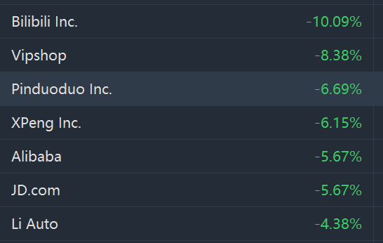 Alibaba, JD.com, Pinduoduo, Baidu, Bilibili, Li Auto, Nio and DiDi fell between 3% and 11%.