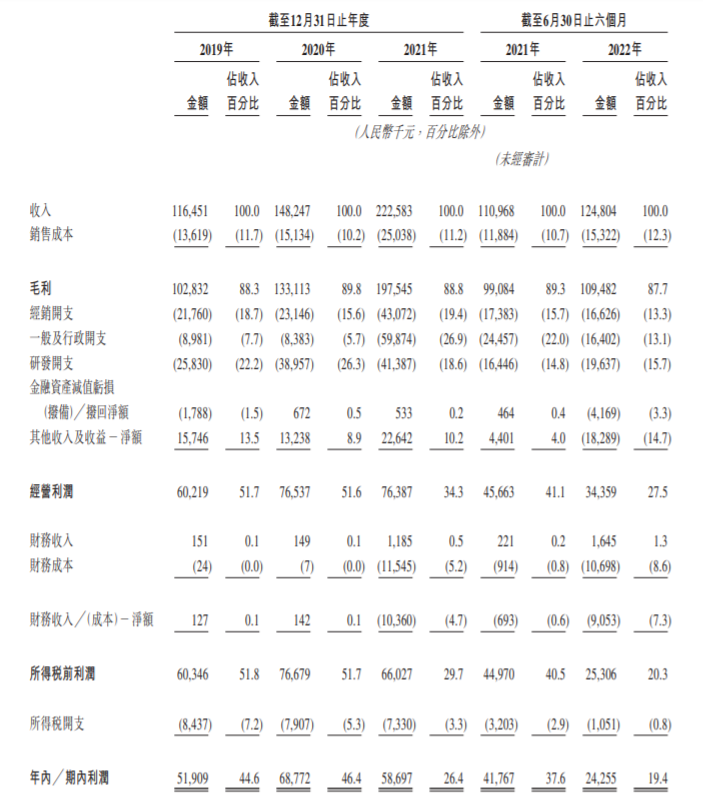 财务方面,2019-2021年,公司的总收入分别为人民币1.16亿元、1.48亿元、2.23亿元,复合年增长率为38.25%;同期毛利率分别为88.3%、89.8%、88.8%;同期净利率分别为44.6%、46.4%、26.4%。
