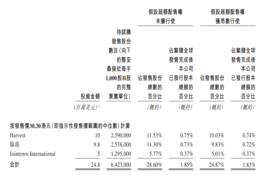 集团已订立基石投资协议,据此,基石投资者已同意按发售价认购合共2480万美元(约1.946亿港元)发售股份。假设发售价为30.30港元(即本招股章程所载指示性发售价范围的中位数),则基石投资者将予认购的发售股份总数将为642.3万股。基石投资者包括Harvest、上海临港全资附属公司上海临港经济发展集团投资管理有限公司、及九州通全资附属公司九州通国际集团有限公司。