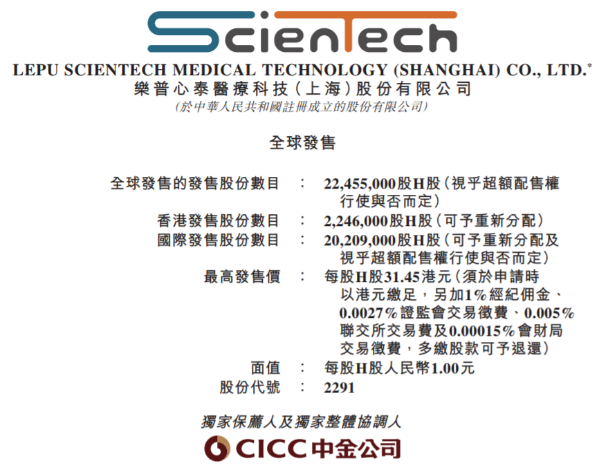 10月27日,心泰医疗发布公告,公司拟全球发售2245.5万股股份,其中中国香港发售股份224.6万股,国际发售股份2020.9万股,另有15%超额配股权;2022年10月27日至11月1日招股,预期定价日为11月1日;发售价将为每股发售股份29.15-31.45港元,每手买卖单位1000股,入场费约31766.97港元;中金公司为独家保荐人;预期股份将于2022年11月8日于联交所主板挂牌上市。【申购入口】
