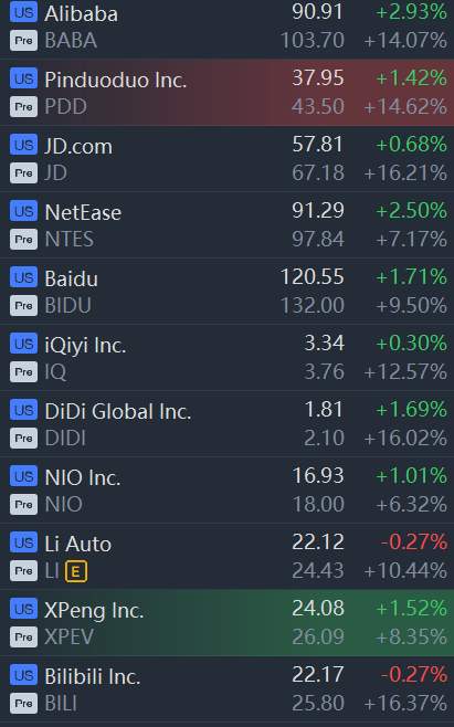 Hot chinese ADRs jumped in morning trading. Alibaba, Pinduoduo, JD.com, Netease, Baidu, Bilibili, DiDi, Nio, Xpeng Motors and Li Auto climbed between 6% and 17%.