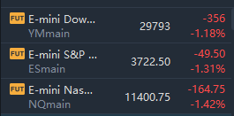 At 7:50 a.m. ET, Dow e-minis were down 356 points, or 1.18%, S&P 500 e-minis were down 49.5 points, or 1.31%, and Nasdaq 100 e-minis were down 164.75 points, or 1.42%.
