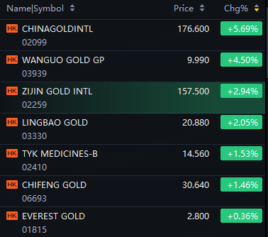 China Gold Intl rose 6%; Wanguo Gold up 5%; Zijin Gold Intl up 3%; Lingbao Gold up 2%; Chifeng Gold up 1%.