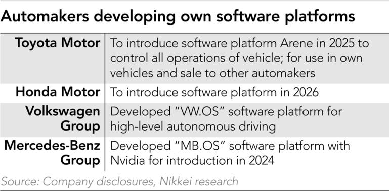 Automakers such as Toyota and Volkswagen are developing their own software platforms for introduction around 2025.