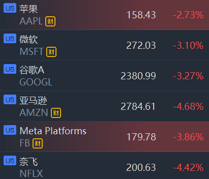 U.S. stocks continued to fall in early trading on Tuesday, with the Nasdaq Composite falling more than 3%, while Apple, Microsoft, Amazon, Alphabet, meta Platforms and Netflix all fell more than 2%.