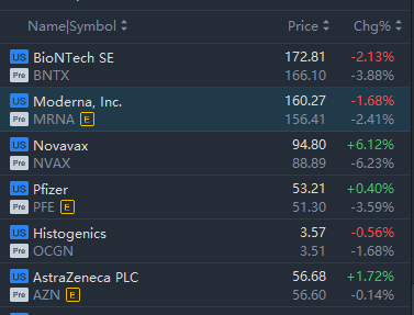 Vaccine stocks slipped in premarket trading, with Novavax down 6.23% and Moderna down 2.41%.