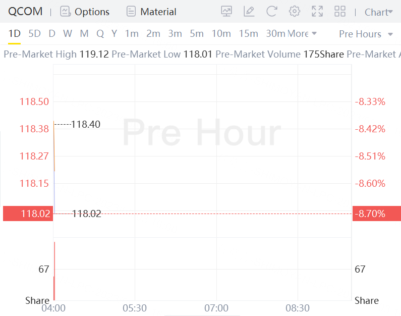 Qualcomm shares fell amid a broader sell-off in tech and chip stocks, with Philadelphia SE Semiconductor Index slipping 3.5%. Analysts are expecting Apple to report its largest fiscal third-quarter revenue drop since 2016 later this week as iPhone sales slow in the U.S. and elsewhere.