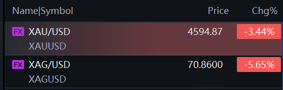 Spot gold fell 3.44% to $4,594.87 per ounce; spot silver fell 5.66% to $70.86 per ounce.
