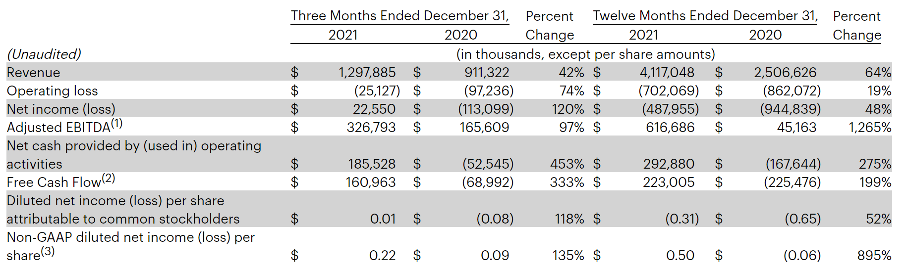 在整个2021财年,Snap的营收为41.17亿美元,与2020财年的25.07亿美元相比增长64%;净亏损为4.88亿美元,与2020财年的9.45亿美元相比收窄48%;归属于普通股股东的每股摊薄亏损为31美分,与2020财年的每股摊薄亏损65美分相比收窄52%;不计入某些一次性项目(不按照美国通用会计准则),调整后每股摊薄收益为50美分,相比之下2020财年的调整后每股摊薄为16美分,相当于同比增长895%。