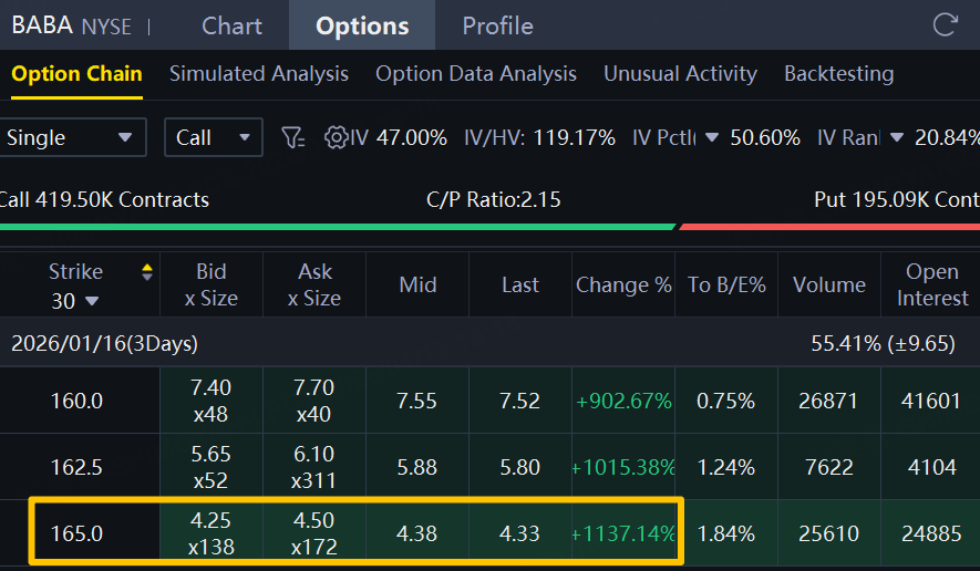 There are 808.4K option contracts related to Alibaba traded on Monday, of which 68% were call options. Call options related to Alibaba showed huge gains on Monday. For example, the $165 strike call options expiring this week soared 1137%.