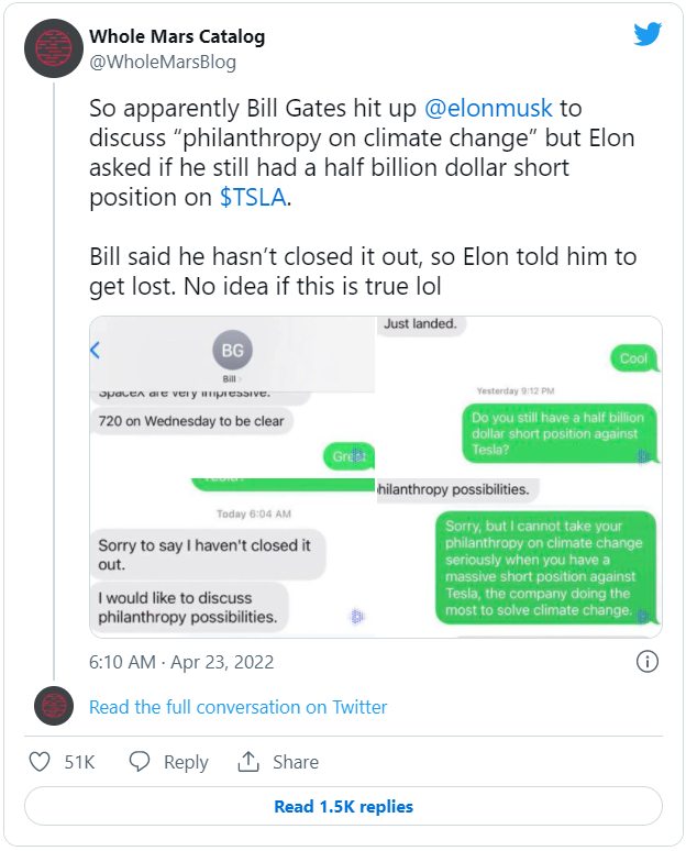 As you can see, the pair are discussing the stock price of both Space X and Tesla when Musk asks, "Do you still have a half a billion short position against Tesla?", at which point Gates confirms he hasn't yet "closed it out".