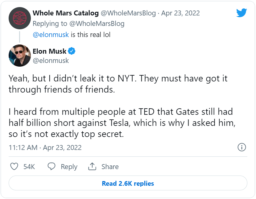 Verified by Musk himself, it would seem the messages are indeed authentic and although he says he did not leak them - suggesting "friends of friends" got hold of them at the New York Times - he does suggest that he believed Gates was trying to short him by "half a billion".