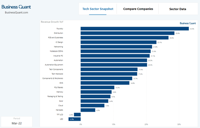 One might argue that maybe all the firms associated with the manufacturing and marketing of semiconductor chips, directly or indirectly, would be adversely impacted due to the ongoing chip shortages. But fact of the matter is that this sales decline isn't prevalent in many industries. For instance, revenue for Foundry and IC Design companies, on average, grew by a massive 33% and 23% respectively, year on year during March 2022.