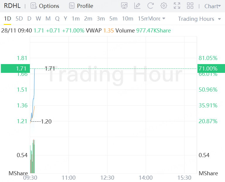 Redhill Biopharma continued to rise 71% in morning trading on Tuesday after surging 216.96% yesterday.