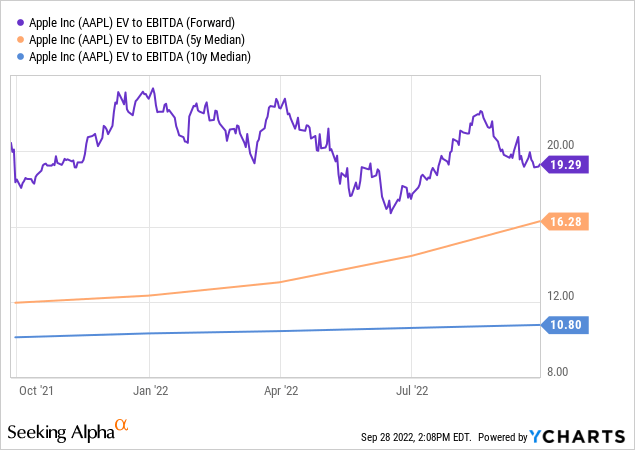 I believe that this means two things: First, Apple is at risk of seeing its valuation compress substantially. A reversal toward the historic norm would result in steep losses for investors. Even if that does not happen, it seems likely that future returns will be limited. Secondly, a stock's valuation can't increase forever, especially not in a recessionary environment where interest rates are climbing. Multiple normalization should offset some of the underlying growth Apple will generate in the future. In the past, buying Apple at or below the historic valuation norm worked very well. Buying it at historic highs will not work as fine, I believe. Five years ago, Apple was trading for 11x EBITDA - it was inexpensive in absolute terms and not historically expensive. Those that bought back then have benefitted from massive multiple expansion tailwinds. But the same will most likely not happen for those that buy here, as Apple is trading well above the historic norm right now, making further multiple expansion rather unlikely, I think.