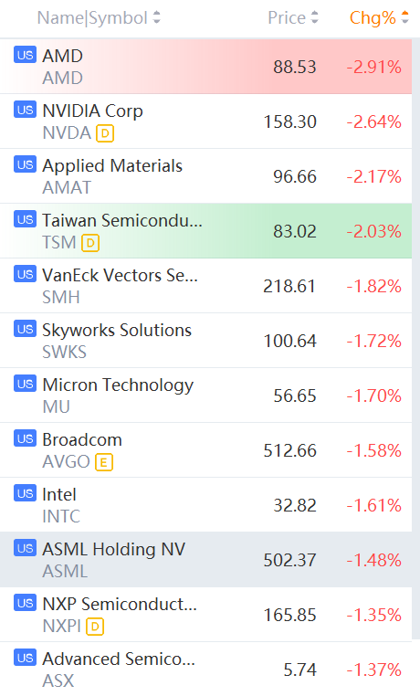 Nvidia, Micron Technology, ASML, STM, Intel, AMD and Applied Materials fell between 1% and 3%.